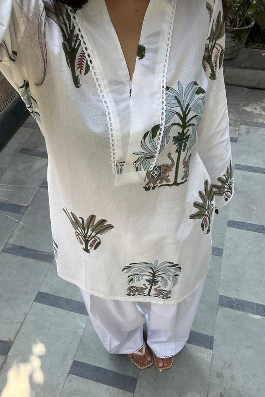 Cotton Palm Tree Block Printed Straight Kurta Farshi Salwar Set-White