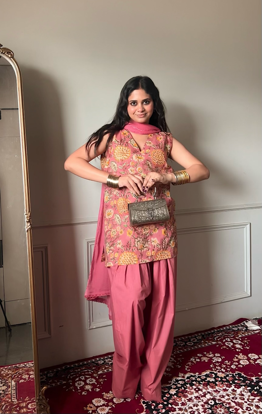 Cotton Block Printed Straight Kurta with Embroidered Farshi Salwar Set-Customisable