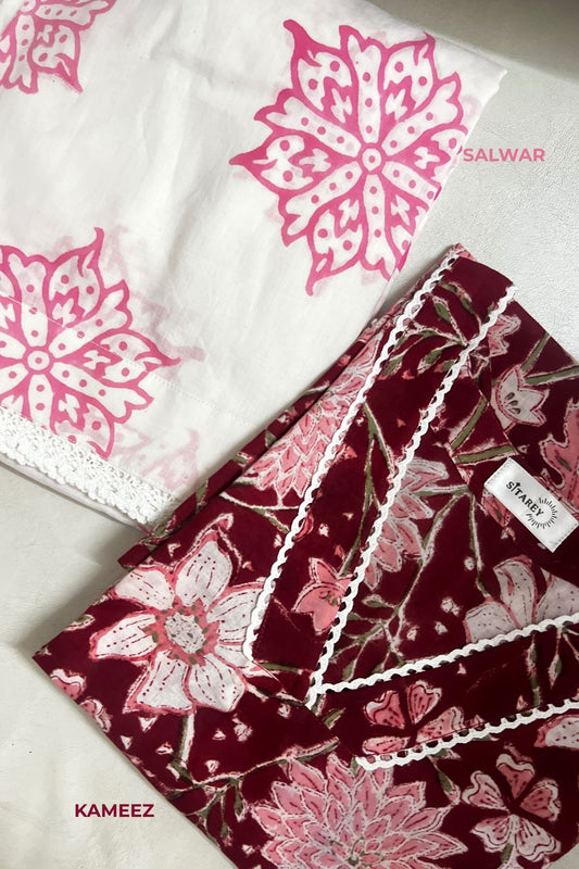 Tulip Cotton Block Printed Straight Kurta Farshi Salwar Set-White & Pink