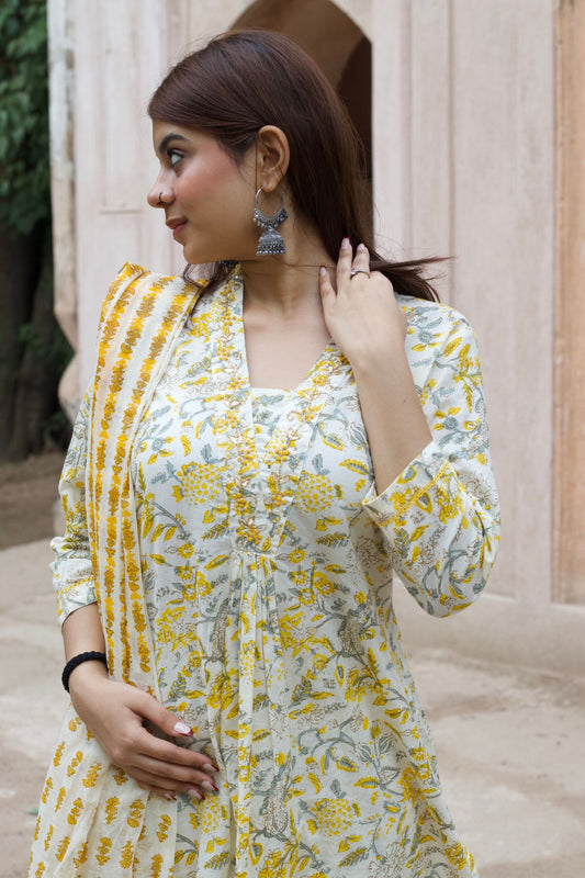 Cotton Jaipuri Print Kurta Set With Dupatta in Yellow