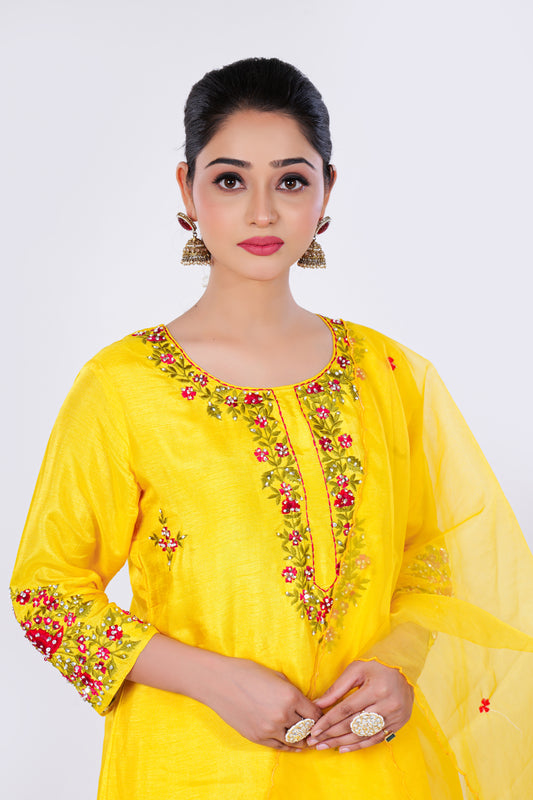 Yellow Silk Hand Embroidered Straight Kurta Set With Organza Dupatta