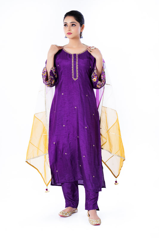 Purple Silk Zardozi Straight Kurta Set With Organza Dupatta