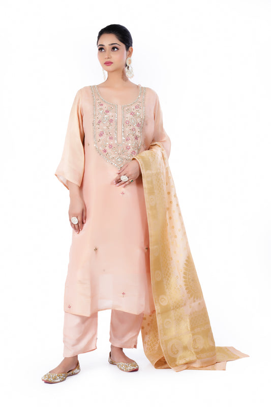Peach Tissue Zardozi Straight Kurta Set With Banarasi Dupatta