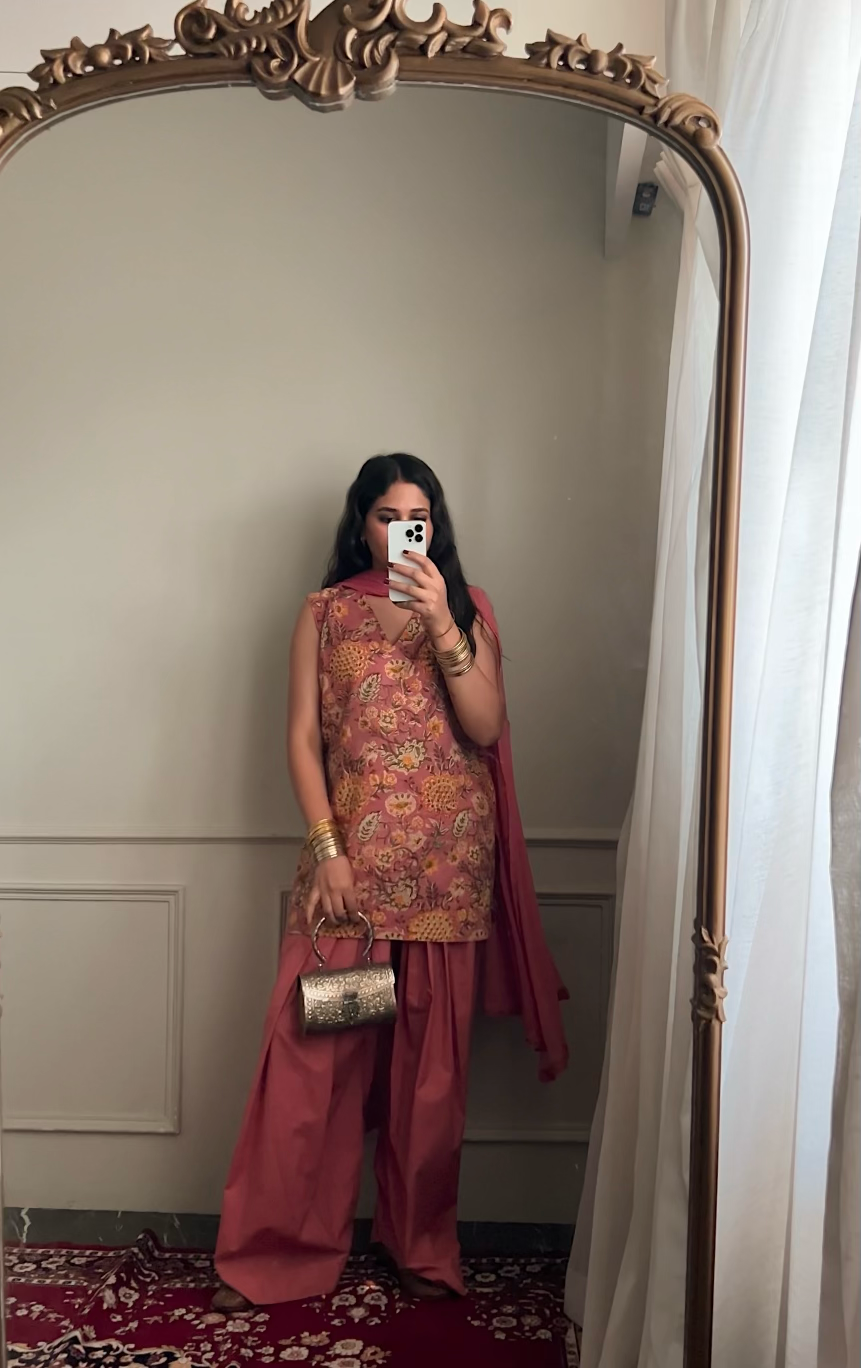 Step out in style with this playful Peach Sleeveless Salwar Kameez Set featuring: